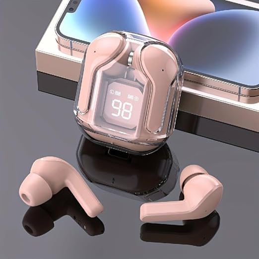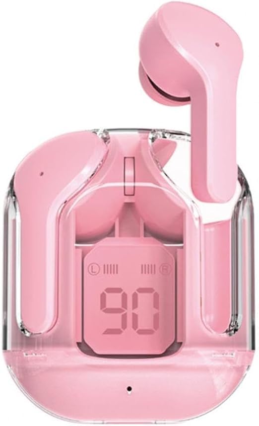 - ١) تصميم عصري: سماعات وردية شفافة مع شاشة LED رقمية لعرض مستوى البطارية والحالة