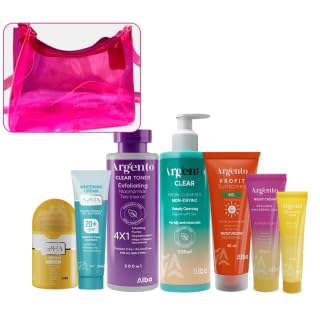 Argento - مجموعة العناية بالبشرة كلير 200 مل + سيروم ازها 30 مل + جل بروفِت 50 مل + تونر كلير 200 مل + كريم الليل 30 جرام + كريم كونتور العين 30 جرام + كريم ازها 30 جرام + شنطة بلون وردي