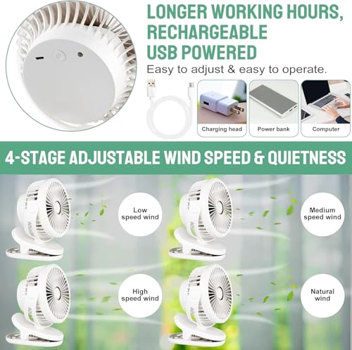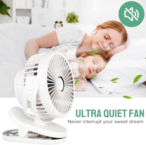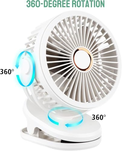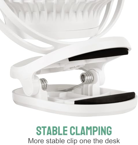 Generic - مروحة تبريد بمشبك قابلة لإعادة الشحن بمنفذ USB، مروحة مكتب دوارة 360° بـ 3 سرعات، مروحة طاولة محمولة ببطارية هادئة للتخييم والسرير والسفر وعربة الأطفال والمكتب والسيارة (أبيض)