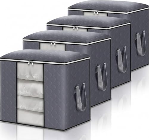 Generic - مجموعة صناديق تنظيم وتخزين خزانة الملابس، قماش مبطن رمادي، صناديق تخزين قابلة للتكديس مع نافذة شفافة، اغلاق بسحاب، حاوية ملابس قابلة للطي مع مقابض، مجموعة من 4 قطع
