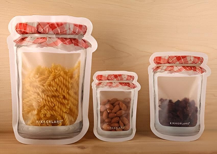 - تتميز كل حقيبة بجزء سفلي فريد من نوعه، مما يسمح لها بالوقوف بشكل مستقيم بمفردها. يساعد هذا التصميم على توفير المساحة ويوفر وصولاً مريحًا إلى محتوياتك، مما يجعل الطبخ والتنظيم أكثر كفاءة.