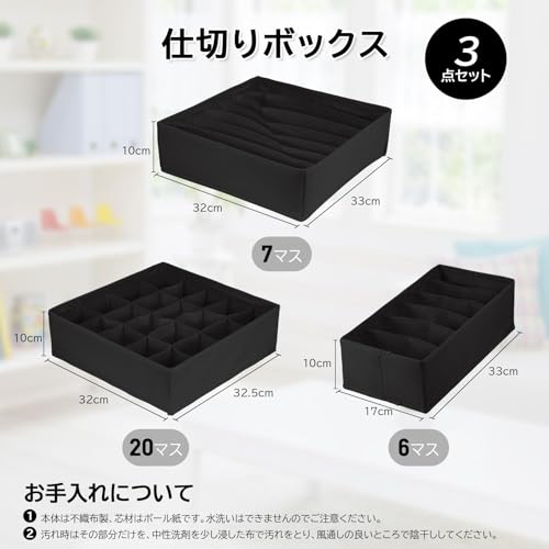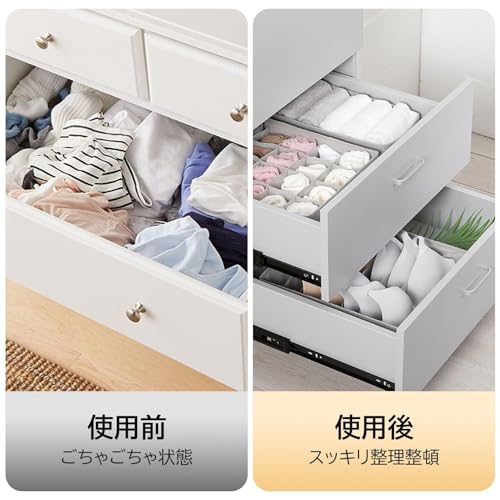 - المنتج عبارة عن مجموعة من ثلاثة صناديق تقسيم مصممة خصيصًا لتنظيم الملابس الداخلية والجوارب، مما يوفر حل تخزين أنيق وفعال لعناصرك الشخصية.