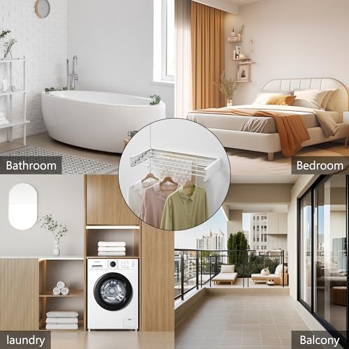 - توفير المساحة: منشر تجفيف الملابس يوفر مساحة كبيرة قابل للطي للاستخدام في الأماكن المغلقة أو في الخارج. تصميم مدمج وقابل للسحب يثبت على الحائط لزيادة المساحة أو إضافة الأناقة إلى مساحاتك. للمنازل ذات المساحة المحدودة والشقق والفنادق وغرف الغسيل. في حالة عدم الاستخدام، قم بطيه بسرعة لتخزينه حتى يصبح جاهز للاستخدام مرة أخرى.