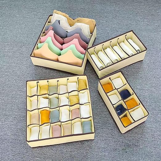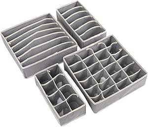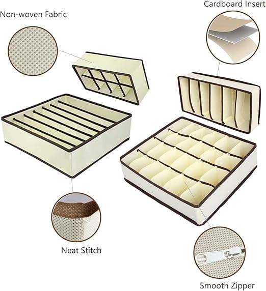 - طقم تنظيم متكامل: يتضمن 4 قطع من صناديق التقسيم المصنوعة من القماش المتين لتنظيم الملابس الداخلية والجوارب وحمالات الصدر والإكسسوارات بشكل منظم ومرتب