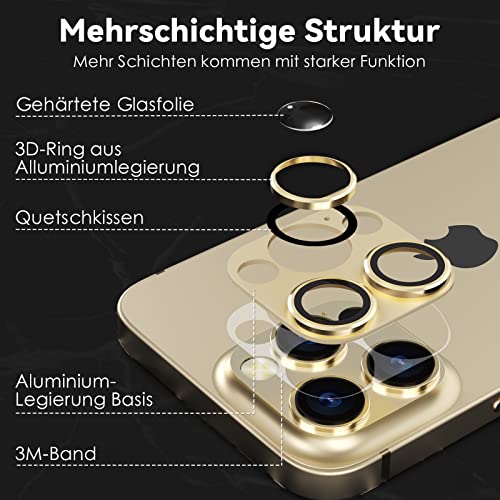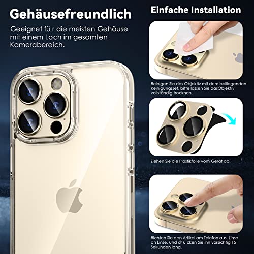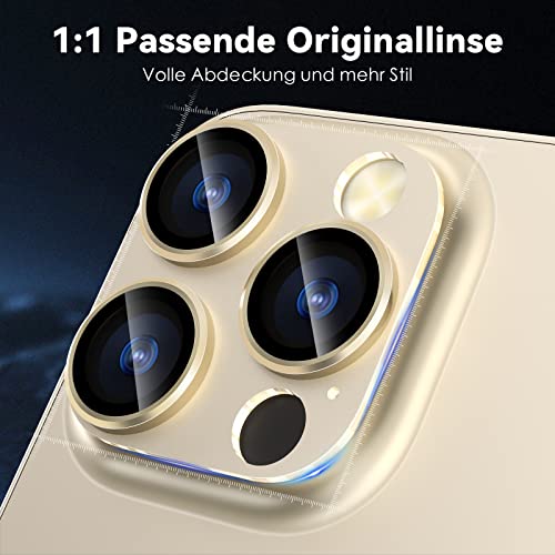 CloudValley - واقي عدسة الكاميرا لموبايل آيفون 14 برو / آيفون 14 برو ماكس، زجاج مقوى بدرجة صلابة 9 معدن ألومنيوم [تصميم الكل في 1] صديق للجراب مضاد للخدش عالي الدقة من كلاود فالي، لون ذهبي