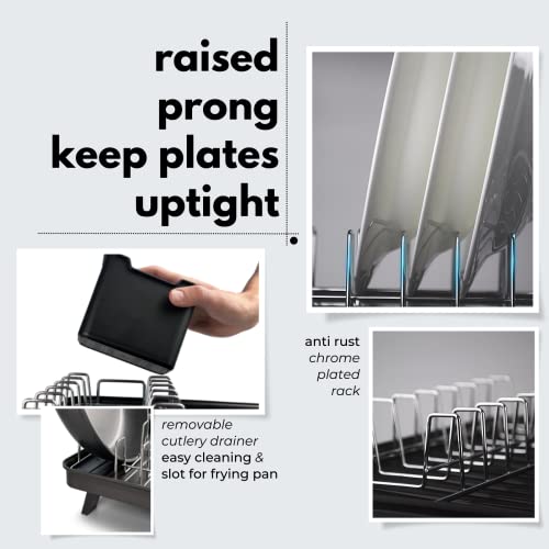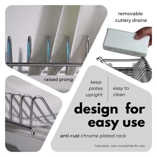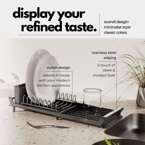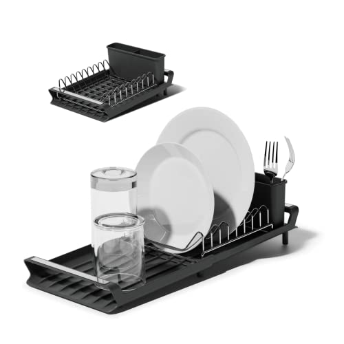 Clove - صفاية أطباق صغيرة قابلة للتوسيع بلون أسود مع صينية تنقيط حامل أدوات المائدة متحرك رف تجفيف من الستانلس ستيل صغير قابل للتمديد لوح تصريف ورمادي