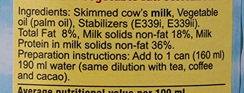 - تركيبة مركزة: تحتوي على 18% من مواد الحليب الصلبة الخالية من الدسم و7.6% من الدهون النباتية لتعزيز القشدة والنكهة.