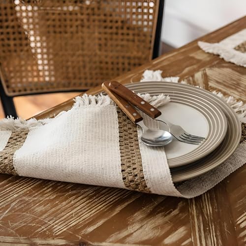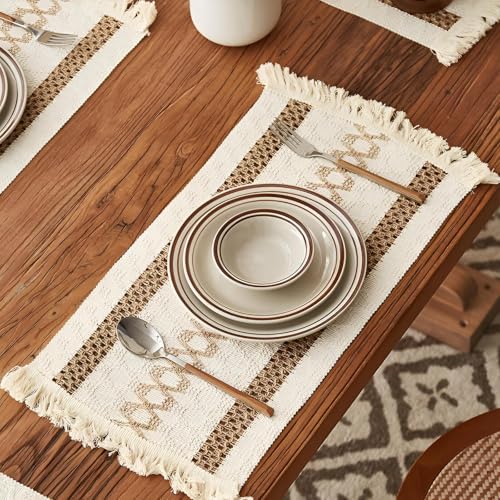 - تتميز مفارش الأطباق البوهيمية هذه بنمط منسوج مميز مع حواف بشراشيب تضيف لمسة من الأناقة البوهيمية إلى أي إعداد لتناول الطعام، وتمتزج بسهولة مع كل من أنماط الديكور الريفي والمعاصر.
