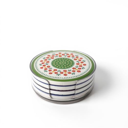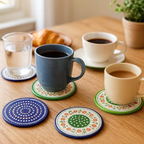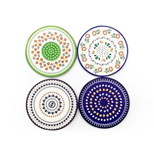• مجموعة من 4 قواعد أكواب أنيقة - تتضمن أربعة قواعد مشروبات مستديرة بأنماط ملونة فريدة، مما يضيف سحرًا إلى طاولة الطعام أو غرفة المعيشة.