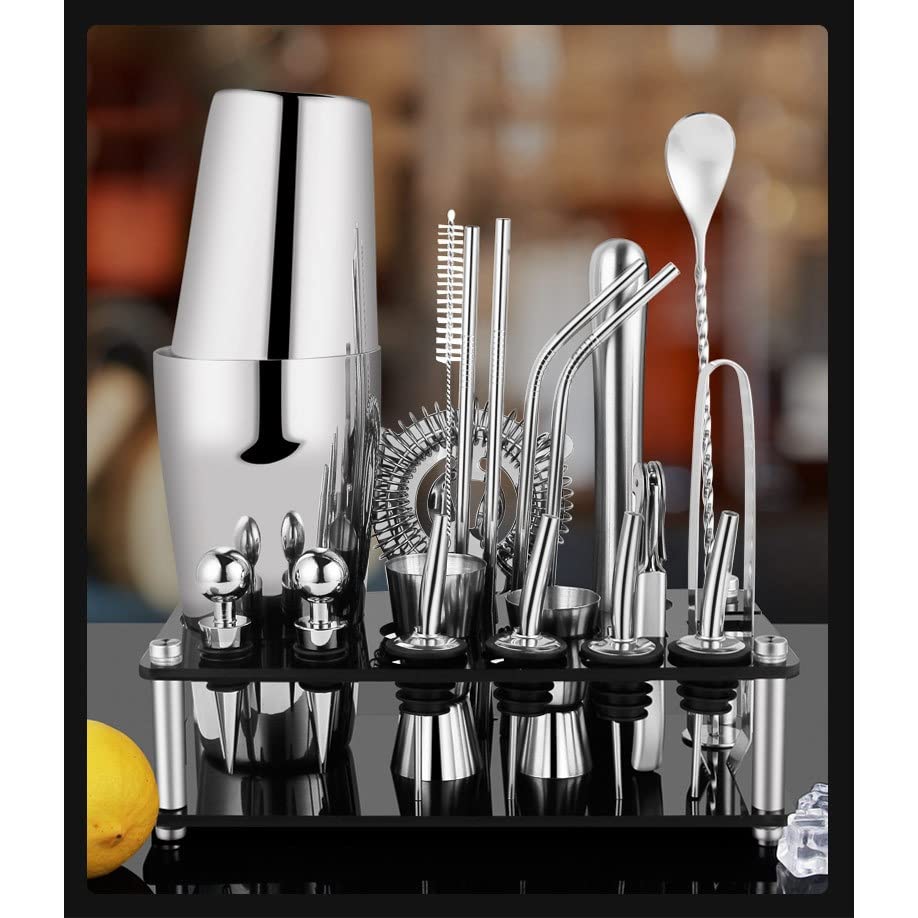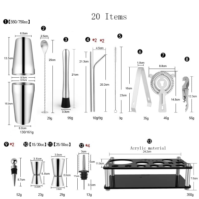 - المواد: ستانلس ستيل 304 آمن غذائيًا، مجموعة شيكر كوكتيل مكونة من 20 قطعة، آمنة وجميلة ومتينة.