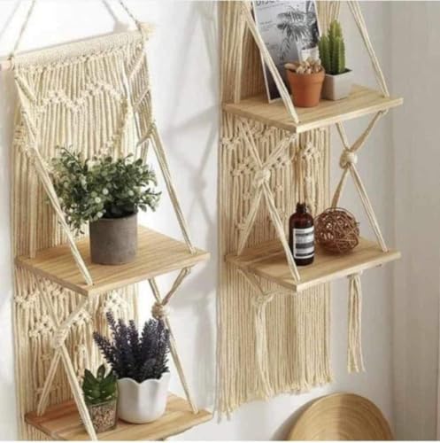 Coccaro Home - مكرمية مجدولة للتعليق على الحائط مع أرفف خشبية من كوكارو هوم