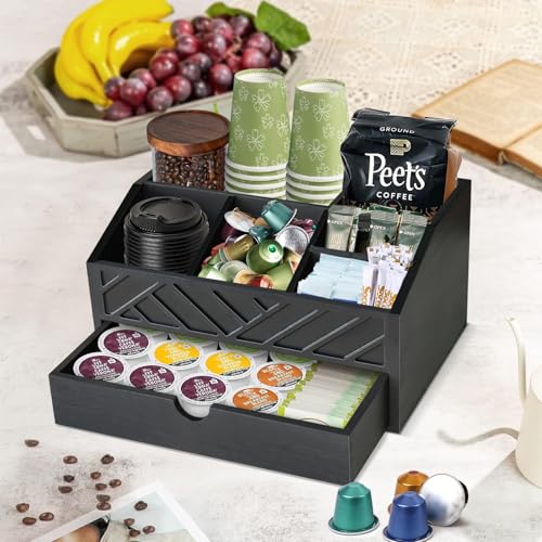 Jorkol - منظم ركن القهوة مع درج لطاولة القهوة وسطح الطاولة، منظم مصنوع من الخشب لاكسسوارات ركن القهوة ومناسب لتزيين ركن القهوة، حامل أكواب القهوة وكبسولات القهوة ومنظم للتوابل بتصميم ريفي (لون أسود)
