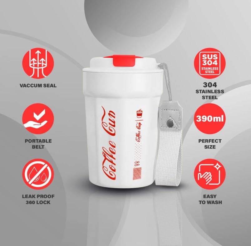 - تصميم صغير الحجم ومريح: يأتي مج القهوة هذا بسعة 380 مل وهو الحجم المثالي لمشروب سريع ومحمول، مما يجعله مثاليًا للقهوة أو الشاي أو المشروبات الأخرى أثناء التنقل.