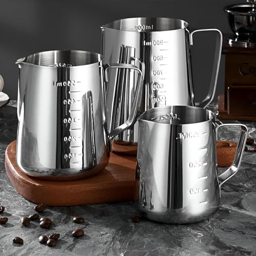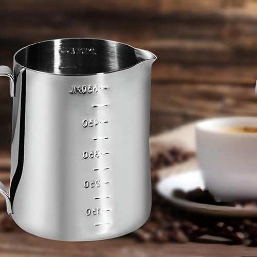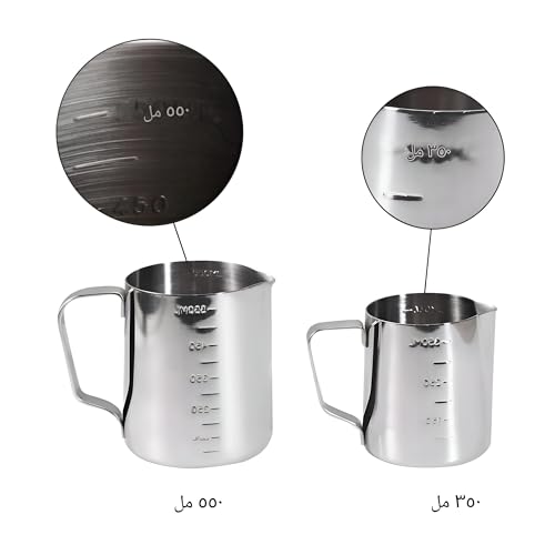 - يتميز هذا الإبريق بمقياس قياس داخلي مدمج، مما يزيل التخمين من خلال السماح بالتحكم الدقيق في حجم الحليب أو السائل أثناء صنع الرغوة. سواء كنت تصنع كابتشينو حريري أو تتقن فن اللاتيه، فإنه يضمن سكب مثالي باستمرار في كل مرة.