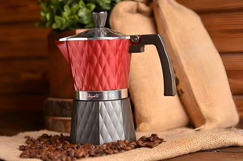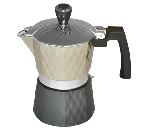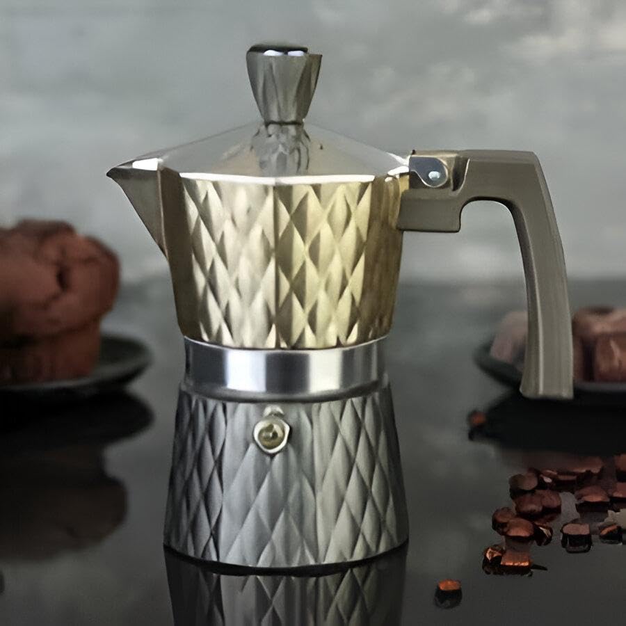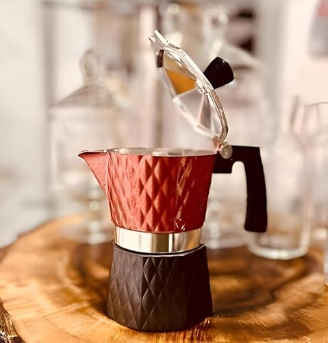 - ماكينة تحضير الاسبريسو على الموقد من الألومنيوم المتين مع مقبض خشبي أنيق، مصممة لتخمير الموكا الغنية والإسبريسو في المنزل، مما يوفر تجربة قهوة إيطالية كلاسيكية.