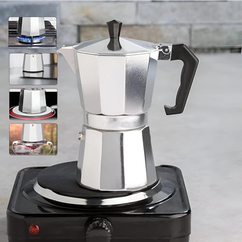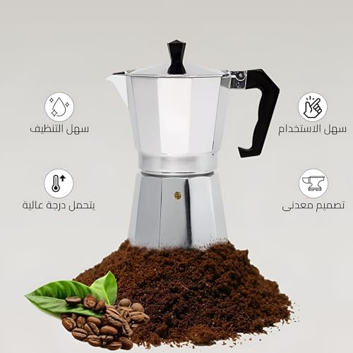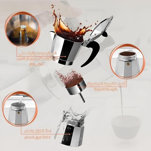 - وعاء قهوة إسبريسو وموكا متوافق مع جميع أنواع المواقد، سواء الغازية أو الكهربائية.