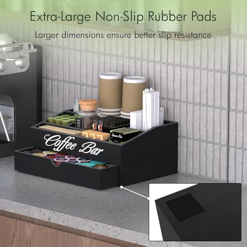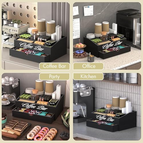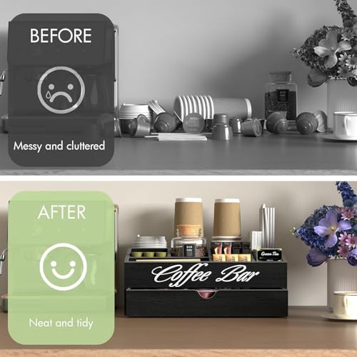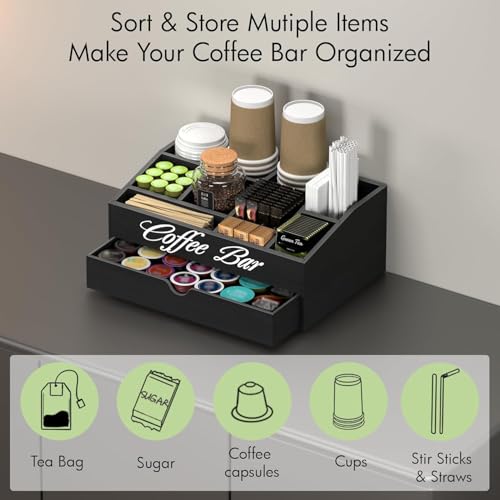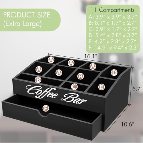 Generic - منظم محطة القهوة، حامل كبسولات خشبي كبير للغاية مع درج، تخزين لاكواب الشاي والشراب والتوابل، ديكور ريفي لتنظيم الاكسسوارات (طبقتان و11 حجرة) - اسود