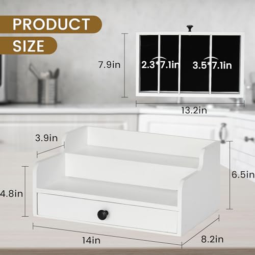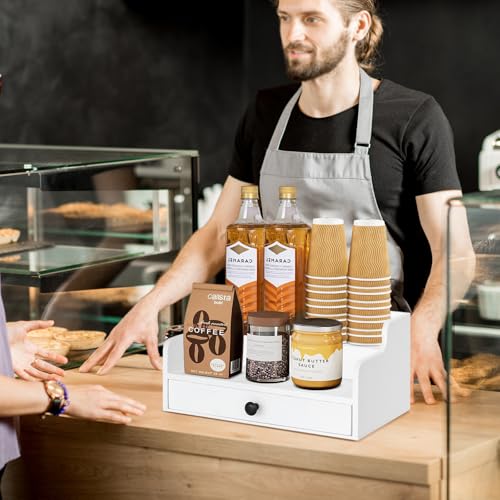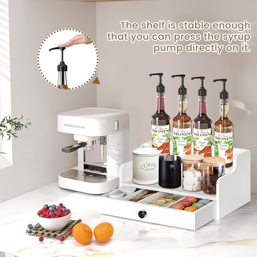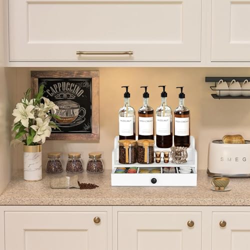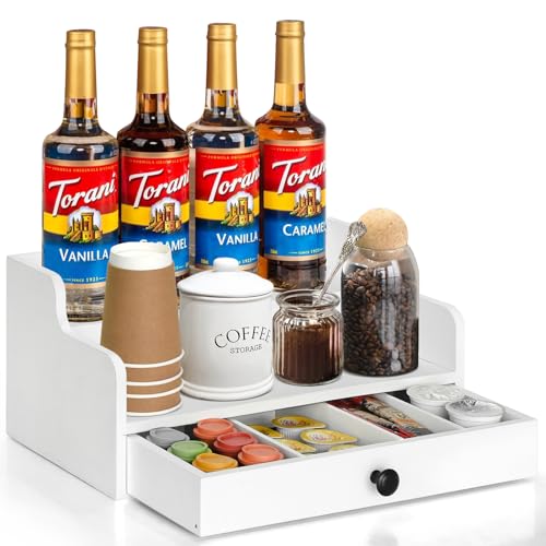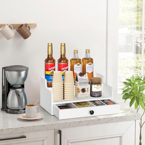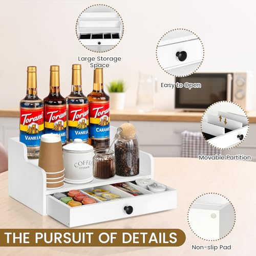 PICKKROSS - منظم محطة القهوة للمنضدة مع درج، سلة تخزين حامل كبسولات القهوة الخشبية، منظم تخزين القهوة والشاي والبهارات (ابيض)