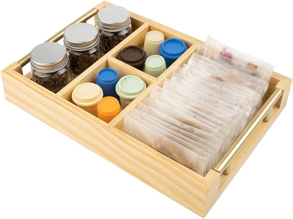Generic - منظم محطة القهوة مع مقبض، منظم ملحقات بار القهوة الخشبي بأربعة أقسام لسطح الطاولة، سلة حامل كبسولات القهوة للقهوة والسكر والشاي والزجاجات، لون خشبي