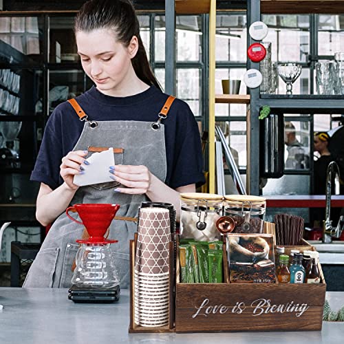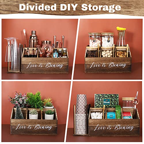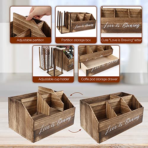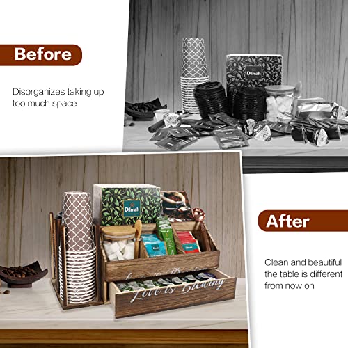 DNANAOL - منظم محطة القهوة - منظم بار القهوة الخشبي لسطح الطاولة والمكتب، محطة تنظيم القهوة مع درج، ديكور مقهى بيت المزرعة لكبسولات القهوة والسكر والأكواب واكياس الشاي (خشب محروق)