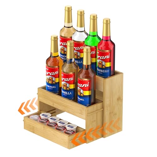 generic - رف منظم لشراب القهوة، حامل زجاجات شراب من الخيزران من 3 طبقات قابل للسحب لبار القهوة، حامل تخزين 10 زجاجات للشراب والنبيذ والتتبيلة لمحطة القهوة في المطبخ.