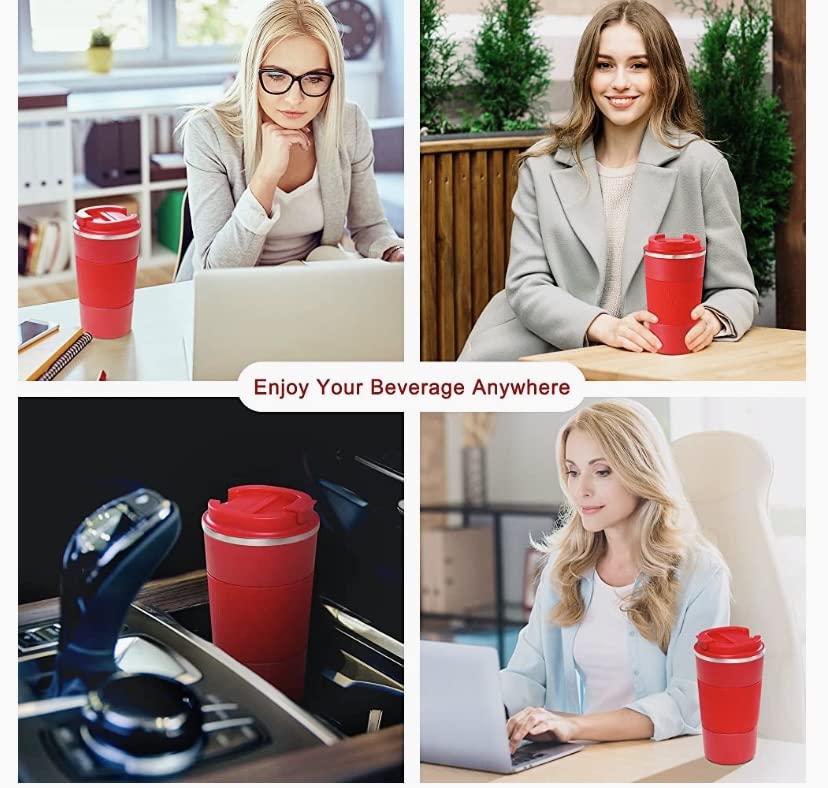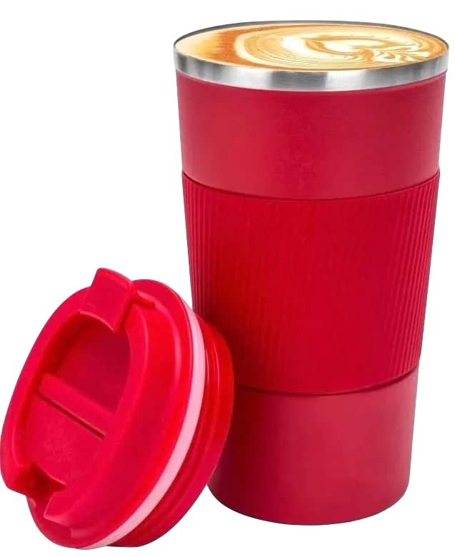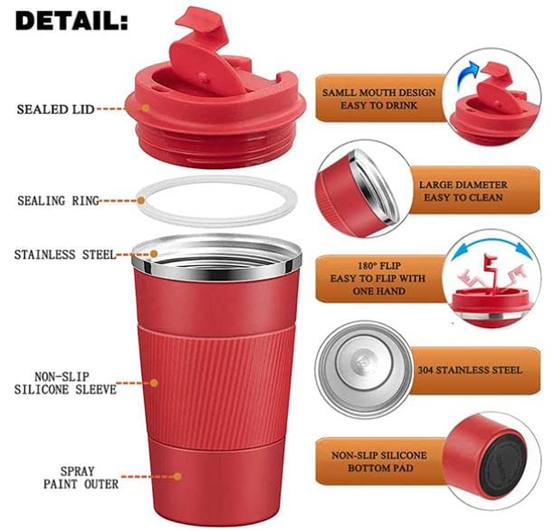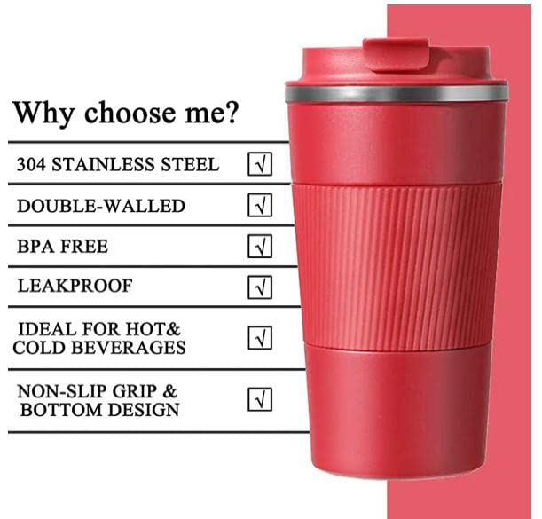 Generic - مج قهوة حراري متين للسفر بجدار مزدوج من الفولاذ المقاوم للصدأ مع غطاء مانع للتسرب للقهوة والشاي والمشروبات والسيارة والمكتب والتخييم - سعة 503 مل - لون أحمر، ستانلس ستيل