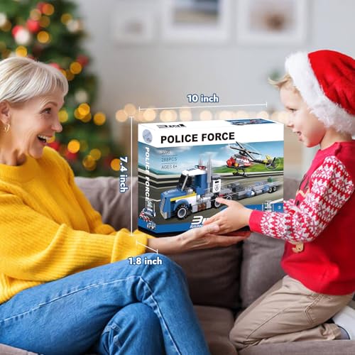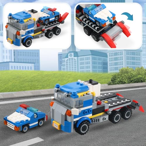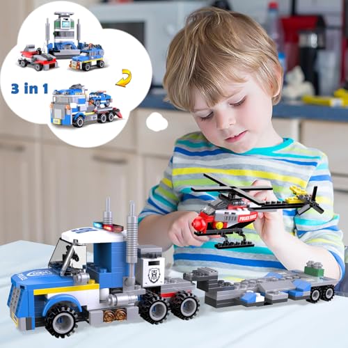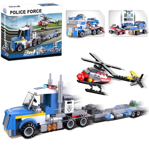 COGO MAN - مجموعة بناء شرطة المدينة 3 في 1 من كوجو مان ألعاب نقل سيارات الشرطة شاحنة مع مقطورة وطائرة هليكوبتر إنقاذ مطاردة هدية للأولاد والأطفال بعمر 6 12 سنة 249 قطعة