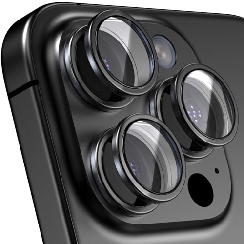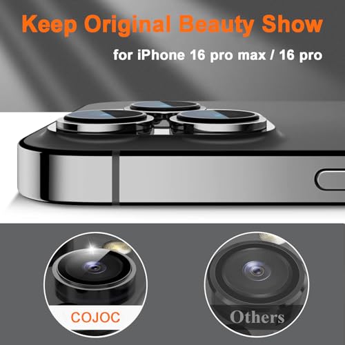 COJOC - واقي عدسة كاميرا لموبايل آيفون 16 برو/آيفون 16 برو ماكس، شاشة حماية من الزجاج المقوى بدرجة صلابة 9 مع غطاء واقي معدني فردي للكاميرا الخلفية من كوجوك، أسود