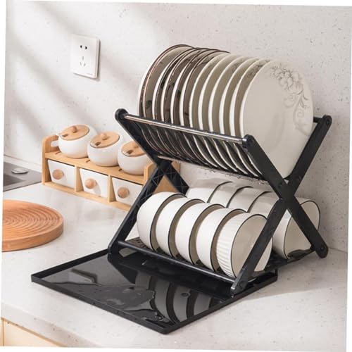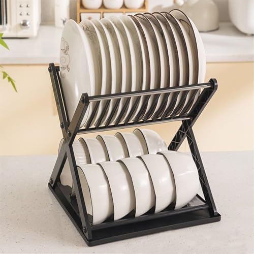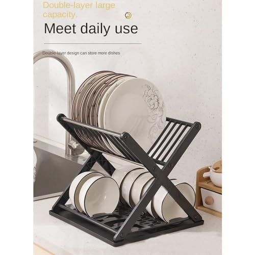 Generic - رف تجفيف اطباق قابل للطي، تصميم من طبقتين باطار على شكل حرف X، بلاستيك اسود، منظم طاولة المطبخ
