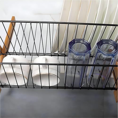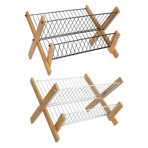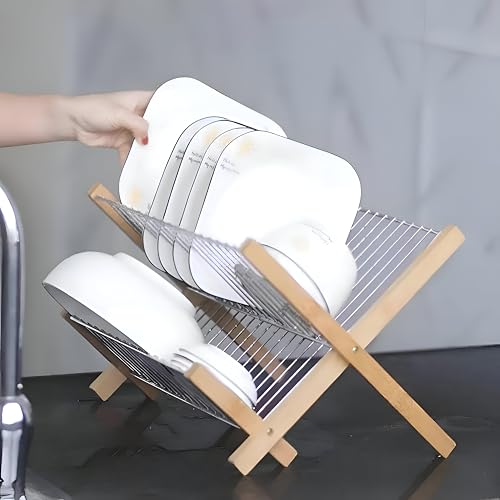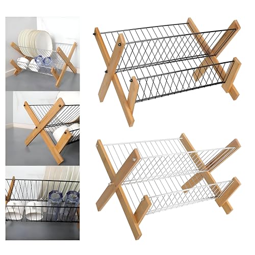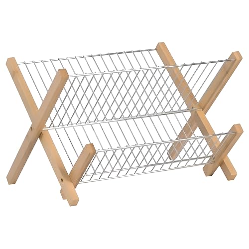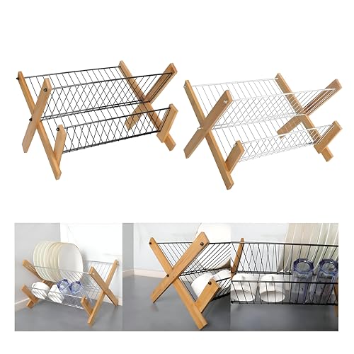 Generic - رف اطباق قابل للطي - محطة تجفيف خشبية وستيل مزدوجة الطبقات مع اطار صغير على شكل حرف X، مثالي لتنظيم الاطباق والأكواب والاواني في المطابخ الصغيرة (38 × 33 × 26 سم)