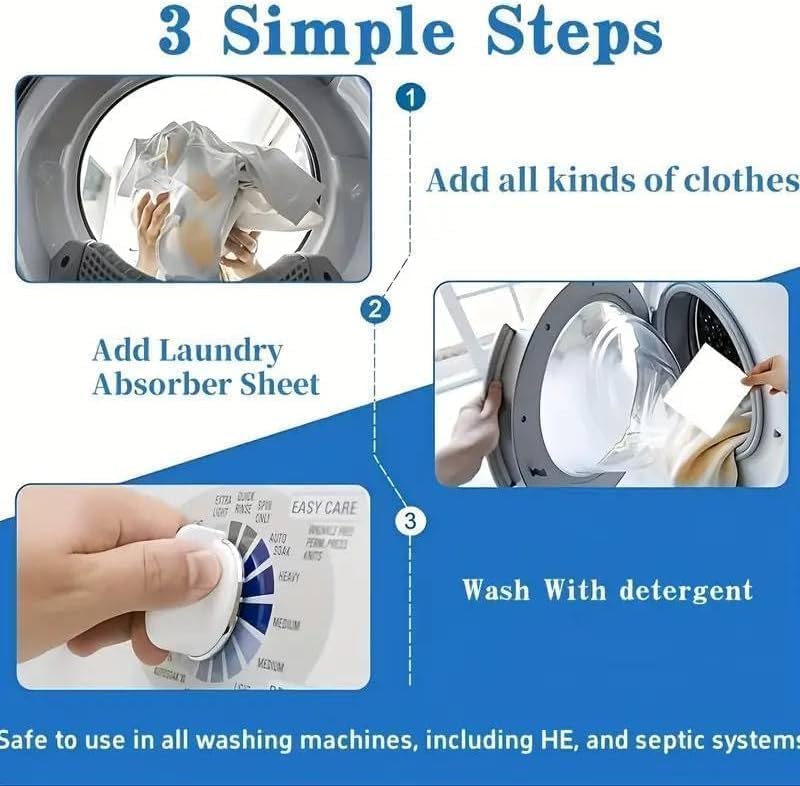 - حل سهل وموفر للوقت - ببساطة ضع ورقة في الأسطوانة قبل بدء الغسيل. لا يتطلب خطوات معقدة أو إعدادات خاصة. يقلل من الحاجة إلى فصل الألوان، مما يوفر الوقت مع إضافة طبقة إضافية من الحماية لكل حمولة.