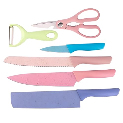 Generic - سكاكين مطبخ مرمزة بالألوان - مجموعة من 6 قطع بمقبض جرانيت مع شفرات من الستانلس ستيل المقاوم للصدأ، مقترنة بمقشرة حادة ومقص لاعداد الوجبات بدون عناء