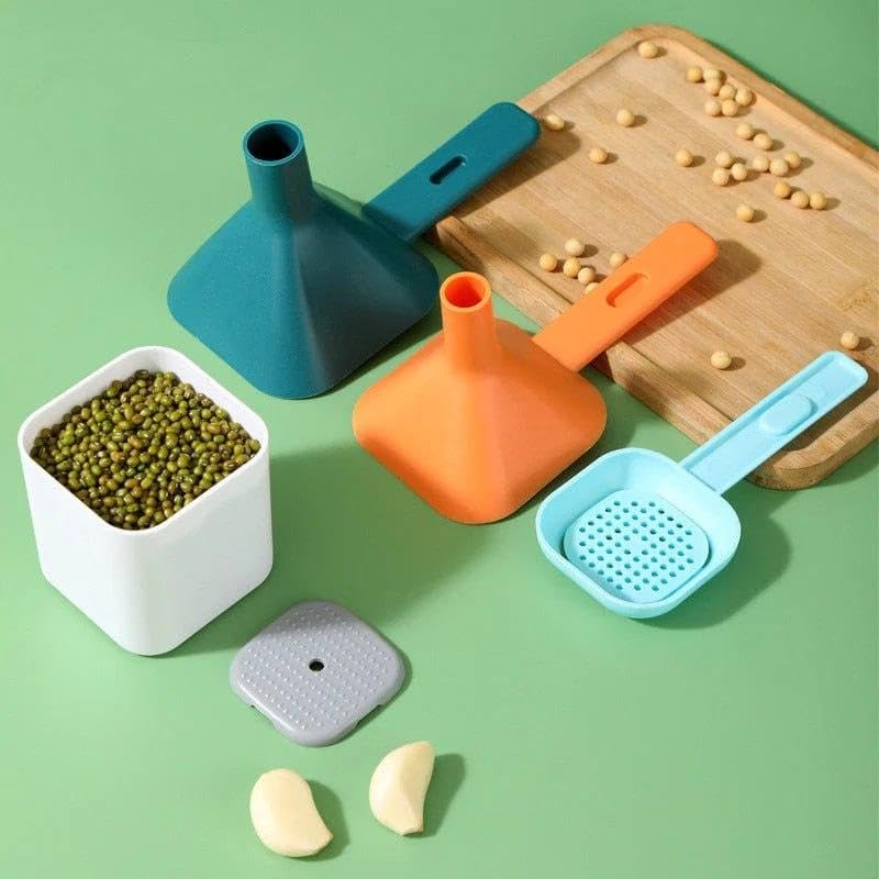 - تأتي مع مقاسين للقمع للتعامل مع قوام المكونات المختلفة، مما يجعل سكب السوائل أو البضائع الجافة أمرًا بسيطًا وخاليًا من الانسكابات أثناء التحضير.