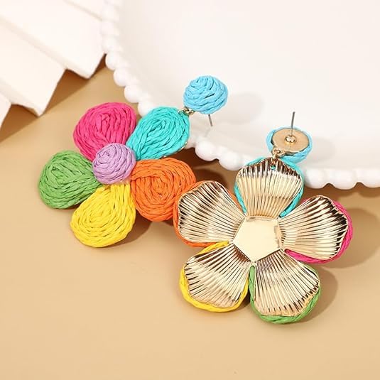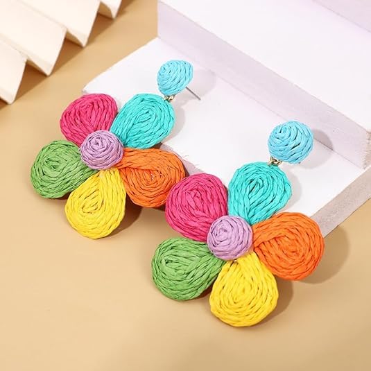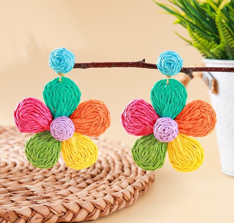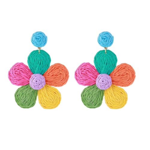 fashion mania - اقراط زهرة الرافيا الملونة المنسوجة يدويا بتصميم بوهيمي صيفي للشاطئ للنساء مجوهرات عصرية