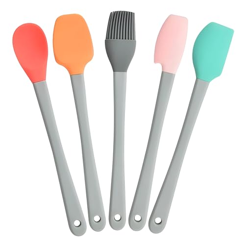 Generic - ادوات طبخ سيليكون ملونة - مجموعة من 5 قطع مع ملاعق مسطحة وملاعق مسطحة وفرشاة زيت ومقابض بلاستيكية لسهولة تحضير المطبخ بالوان زاهية