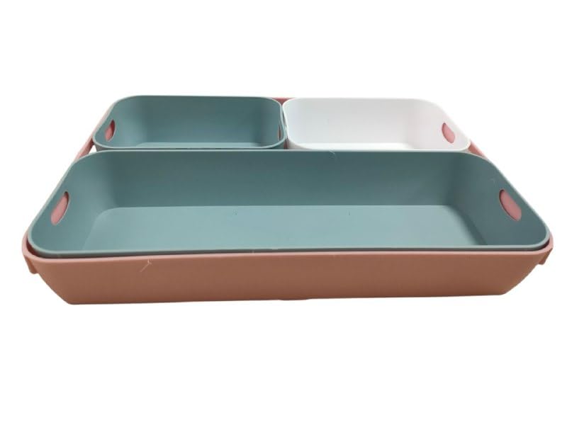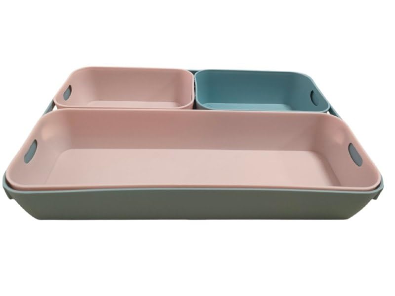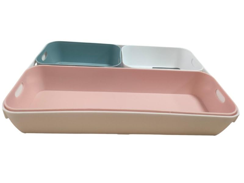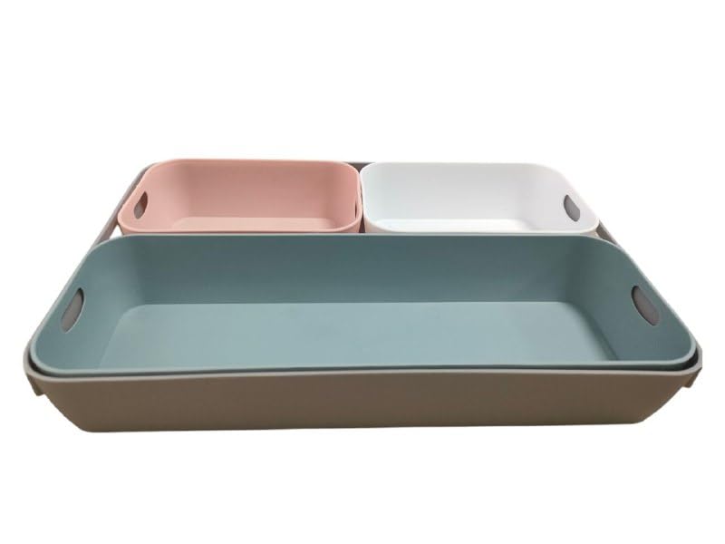- مجموعة عملية: مجموعة صناديق تخزين مكونة من أربعة قطع بثلاثة أحجام مختلفة يمكن وضعها على المكتب أو في الدرج أو في دولاب الحمام. تصميم عملي: صناديق تنظيم للمكتب مصنوعة من مواد مرنة وقوية ويمكن تكديسه داخل بعضها البعض. متعددة الوظائف: يمكن استخدام صناديق الأدراج لتخزين اللوازم المكتبية والمكياج ومستحضرات التجميل وإكسسوارات المكياج وأدوات المائدة وأدوات المطبخ وأدوات النظافة. موفرة للمساحة: يمكن تخزين الصناديق الملونة في الدولاب أو الدرج أو على الرف في حالة عدم الاستخدام بفضل وظيفة التكديس