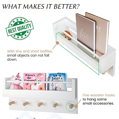 - [حجم صغير، مجموعة من ثلاثة] أرفف معلقة على الحائط بلون أبيض، ديكور مثالي لغرفة الأطفال. أحد أرفف الكتب المعلقة على الحائط لغرفة الأطفال هو 39.1 سم × 12.9 سم × 9.9 سم مع خمسة خطافات خشب، حيث يمكن تعليق بعض الأشياء الصغيرة. يبلغ مقاس رفي كتب الأطفال الآخرين 39.1 سم × 18.5 سم × 9.9 سم، لديهما طريقتان للتعليق لزيادة مساحة التخزين