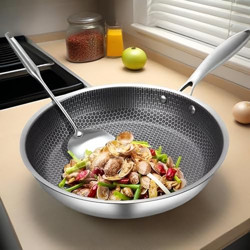 - طاسة القلي غير اللاصقة هذه مصنوعة من الفولاذ المقاوم للصدأ عالي الجودة، ومصممة على شكل خلية نحل سداسية فريده من نوعها، والذي لا يوفر جاذبية جمالية فحسب، بل يضمن أيضًا توزيعًا متساويًا للحرارة على سطح الطهي بالكامل.