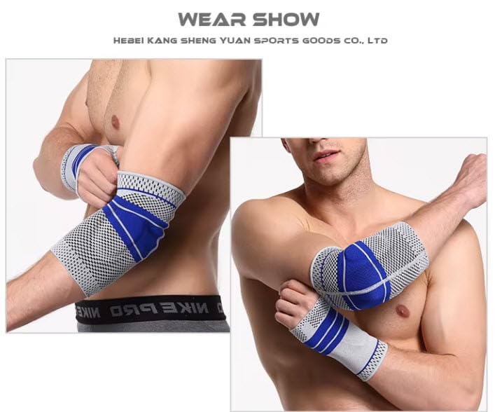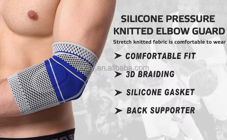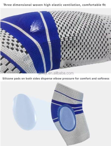 - مواد عالية الجودة: مزيج من النسيج المشبك والسيليكون لتوفير المرونة والدعم المثالي للكوع