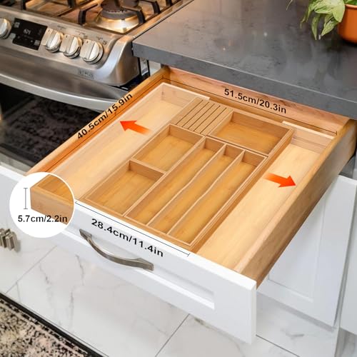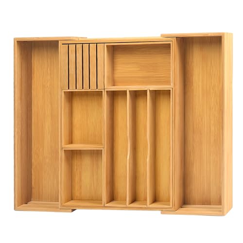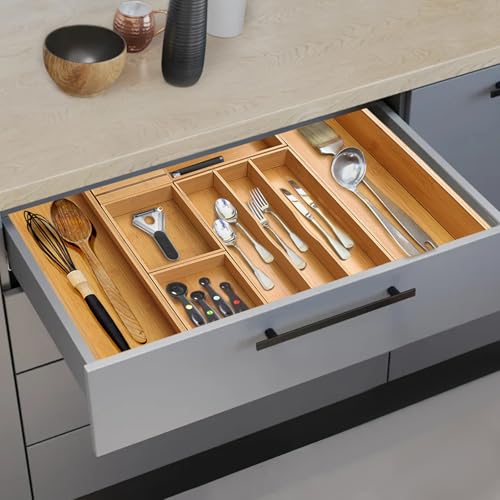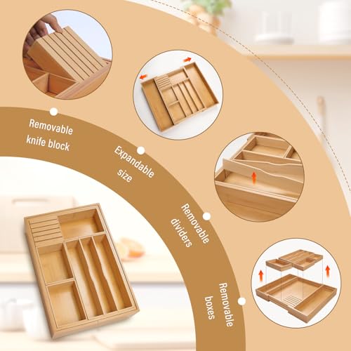 comfoyar - منظم أدراج المطبخ من الخيزران، صينية أدوات مائدة فضية قابلة للتوسيع مع فواصل أدراج مخددة قابلة للإزالة وكتلة سكاكين، لأدوات المائدة وأدوات المطبخ، 3-10 فتحات طبيعية من كومفويار