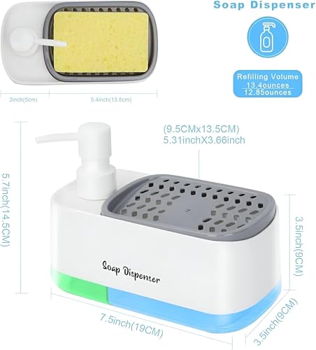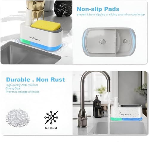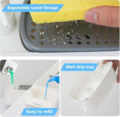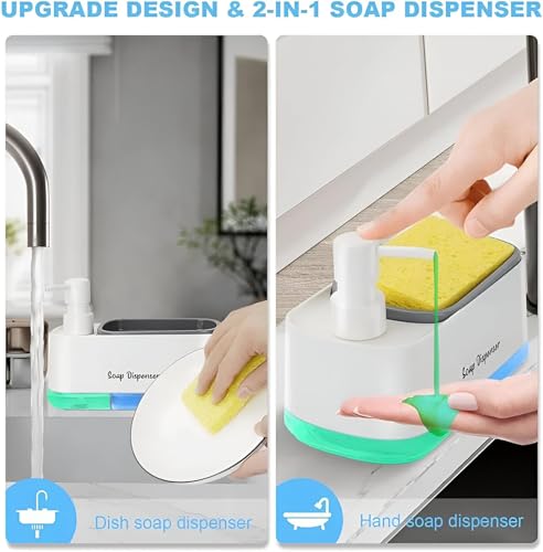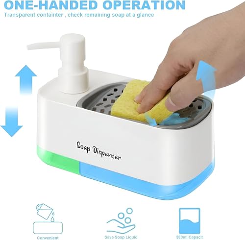 - يتميز موزع الصابون هذا بتصميم 2 في 1، يجمع بين وظائف متعددة في وحدة واحدة، بما في ذلك مضخة صابون يدوية، وموزع صابون للأطباق، وحامل إسفنجة مدمج، ما يوفر مرونة وراحة في الاستخدام.