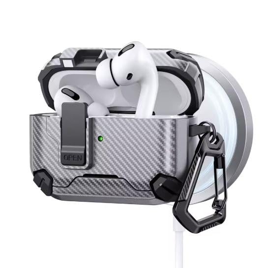 Generic - حافظة متوافقة مع AirPods Pro 3، كربون فايبر، رمادي، حماية صلبة مع كاربينر