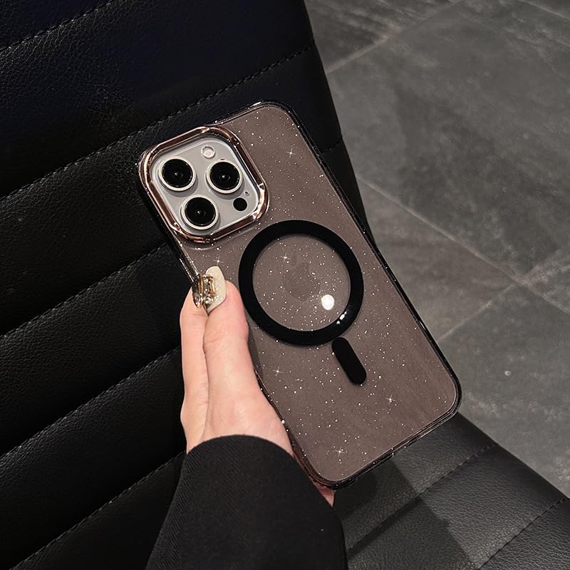 - جراب حماية مزين بجليتر أسود متوافق مع موبايل ايفون 16 برو، جراب حماية ممتص للصدمات بتصميم لامع لطيف مع إطار لحماية الكاميرا للنساء والبنات (لون روز جولد)