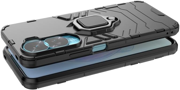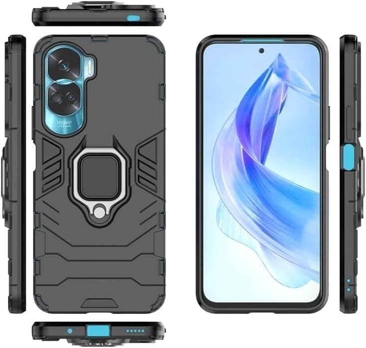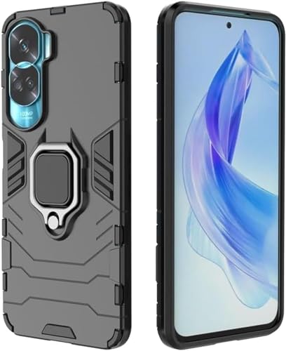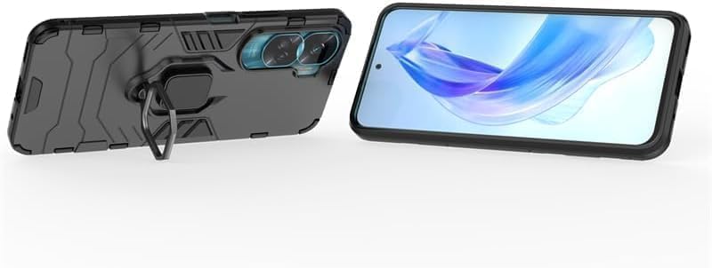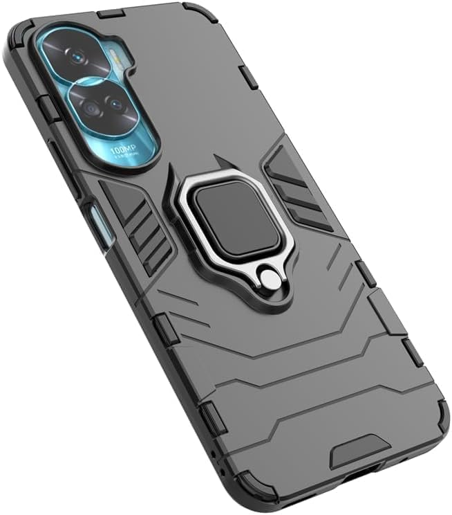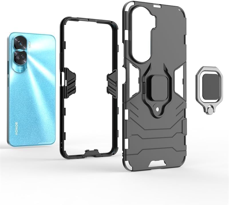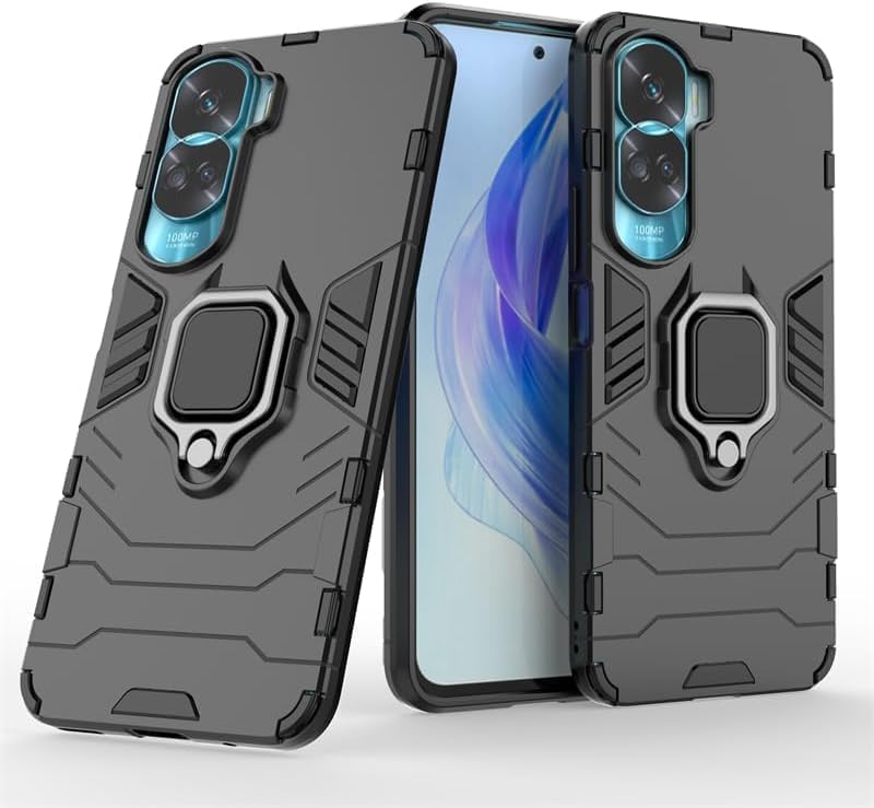 - جراب موبايل مزدوج الطبقات مضاد للصدمات مع مسند بتصميم حلقة مغناطيسية لموبايل هونر 90 لايت الجيل الخامس 5G من البلاستيك الأسود
