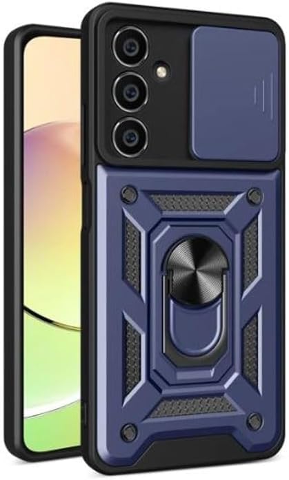 - جراب حماية واقي شديد التحمل مع مسند حلقي وغطاء كاميرا منزلق لموبايل سامسونج جالاكسي A24 - لون أزرق