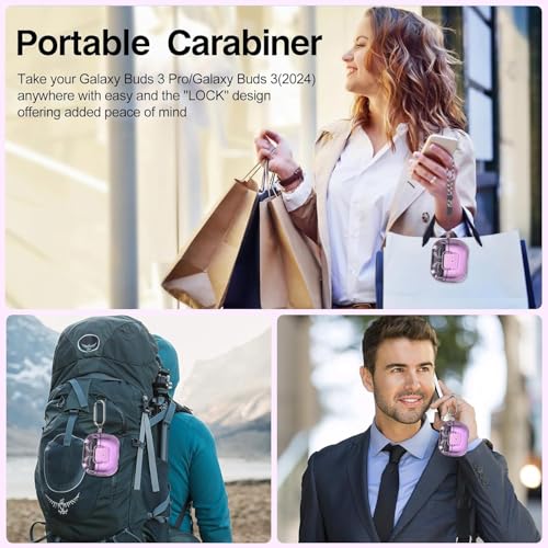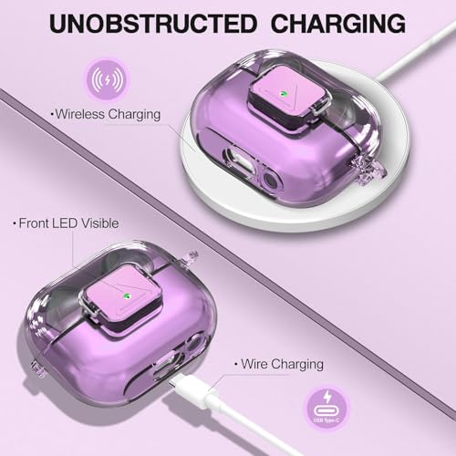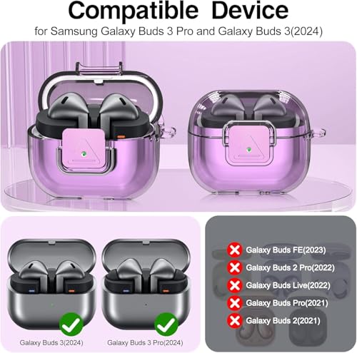 ELMO3EZZ - جراب متوافق مع سماعات سامسونج جالاكسي بادز 3 برو مع مشبك قفل آمن، حافظة شفافة مرنة من البولي يوريثين المقاوم للحرارة لجالاكسي بادز برو 3، جراب حماية مضاد للصدمات (أرجواني شفاف)