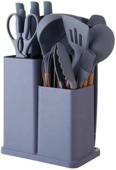 Generic - مجموعة ادوات طبخ منزلية كاملة مكونة من 19 قطعة من سكاكين الستانلس ستيل والسيليكون، ادوات مطبخ خشبية، لوح تقطيع جرانيت وحامل عملي للاستخدام اليومي في المطبخ