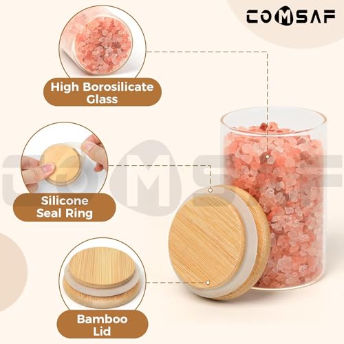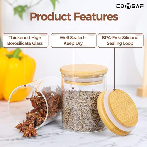 ComSaf - برطمانات توابل مع غطاء محكم الغلق من الخيزران، زجاجات توابل زجاجية فارغة، حاويات توابل للتوابل والملح والسكر وحبوب القهوة (دائرية/220 مل/12 قطعة)