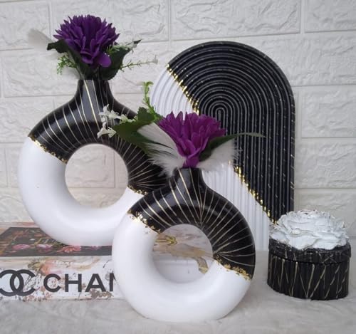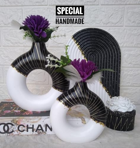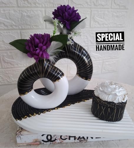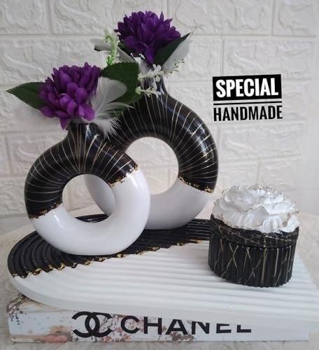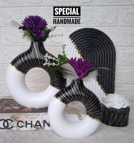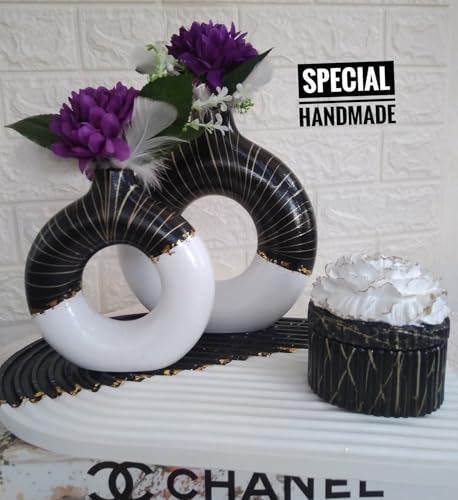 Generic - مزهرية دوناتس من الكونكريت بتكنيك السحاب المطاط بعدد ٢ دوناتس و١ كوستر قوس و١ بونبونيرة بغطاء وردة جوري مع الزهور الموجودة بالصور وفروع ريش ديكور بيضاء مصنوعة يدوياً ١٠٠٪