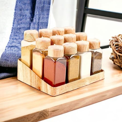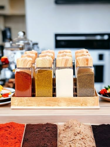 طقم رف ومنظم بهارات – عبوات شفافة بأغطية محكمة مع تصميم خشبي أنيق وملصقات أسماء التوابل Q